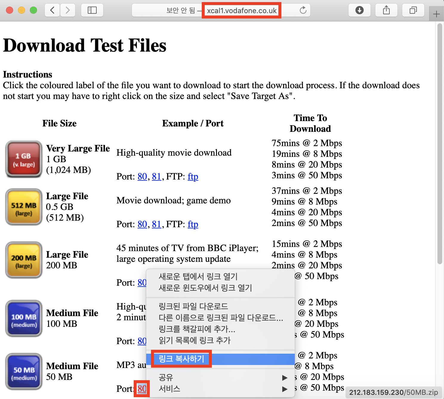 50MB 정도 되는 파일 80포트를 우클릭해서 링크를 복사해줍니다.