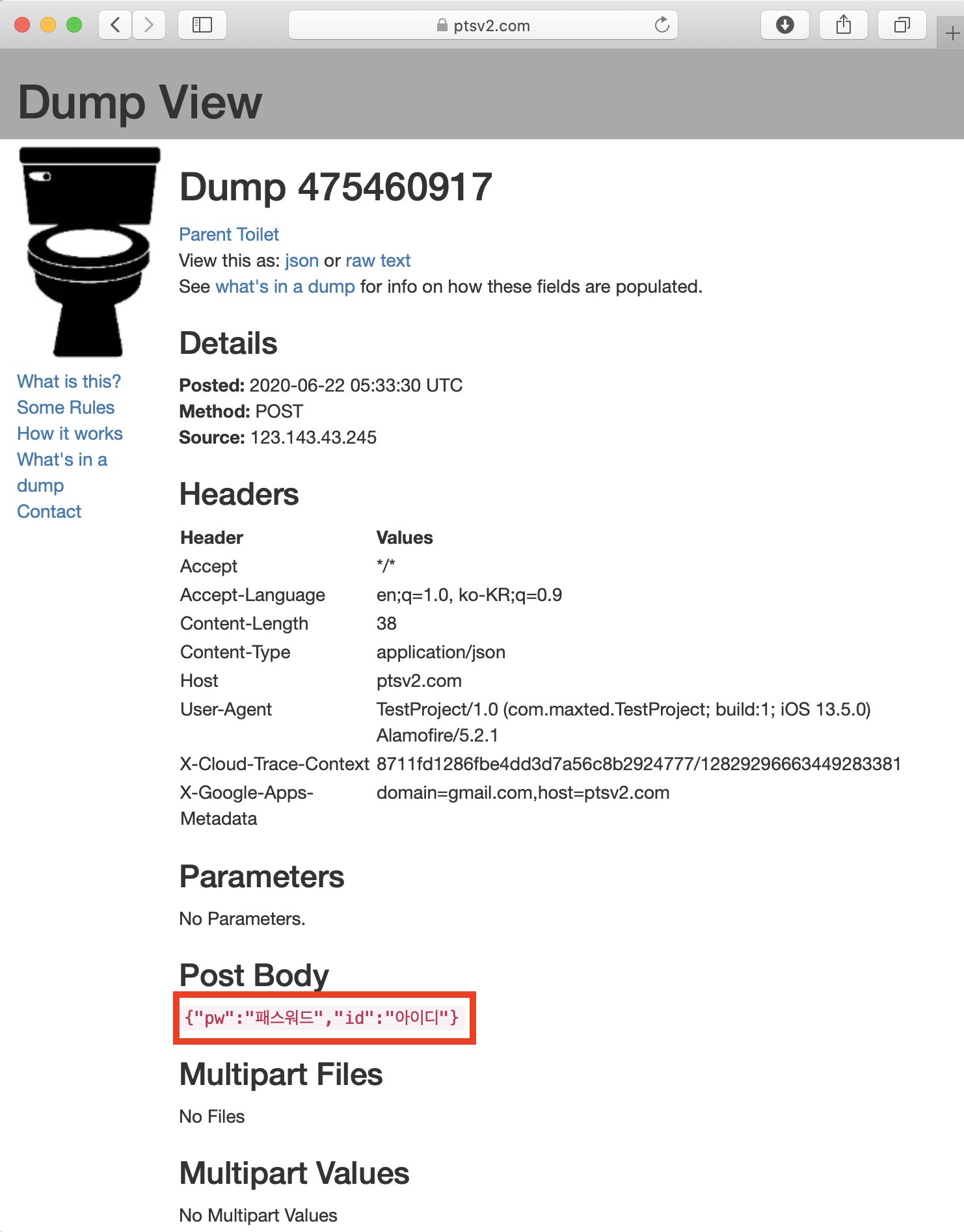 Post Body 란에 우리가 보낸 정보가 잘 들어와있는 것을 확인할 수 있습니다.