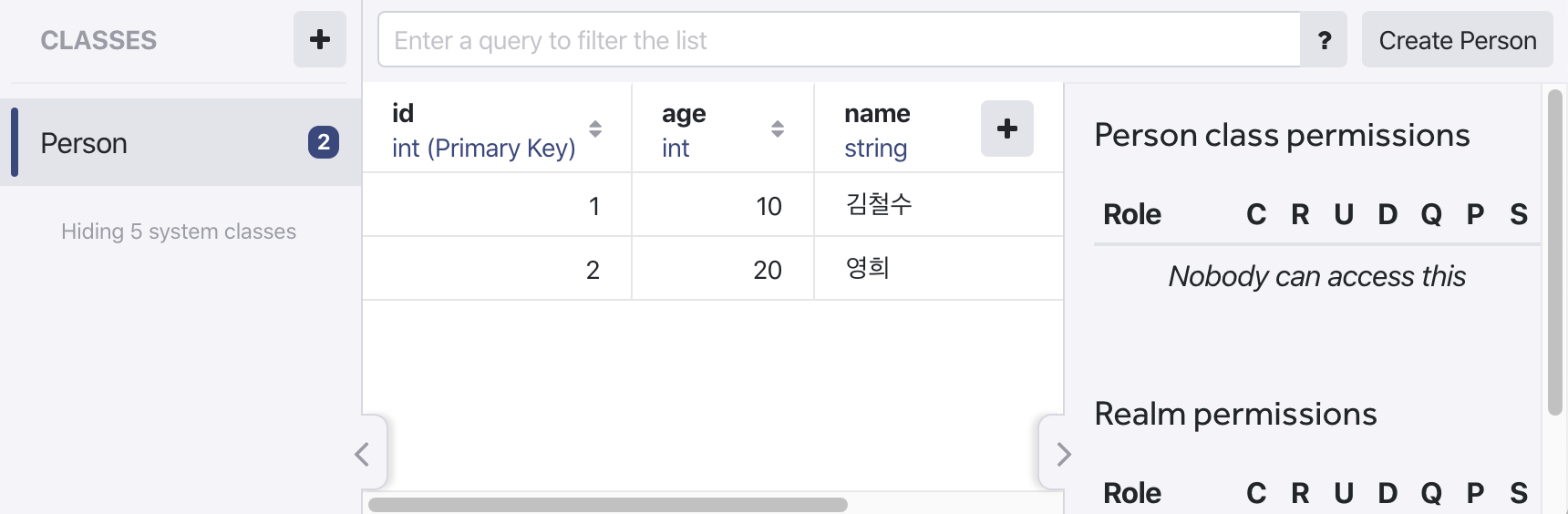 ( Person 에 id , name , age 로 realm 을 만들었다가