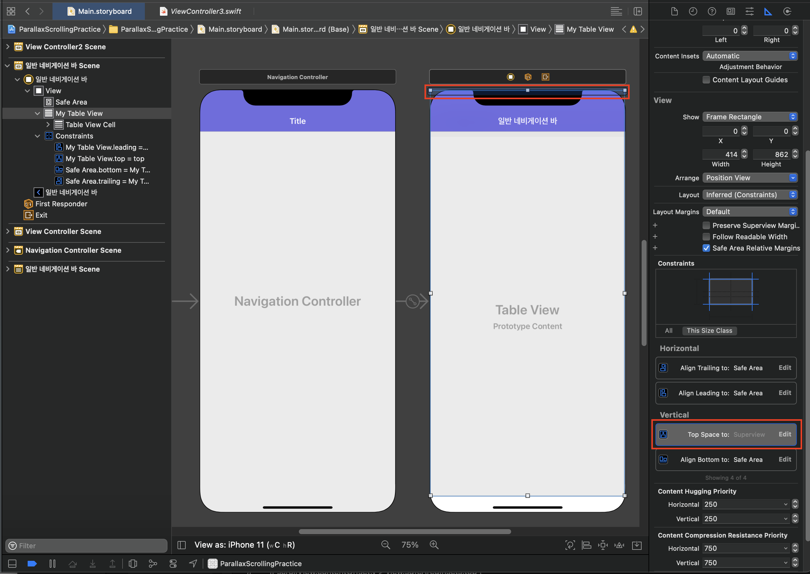 테이블뷰의 상단을 슈퍼뷰에 연결해주세요. (Safe Area 에 연결하면 네비바가 다시 내려오지 않습니다.)