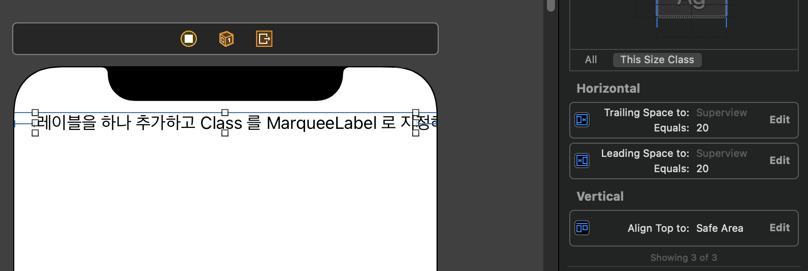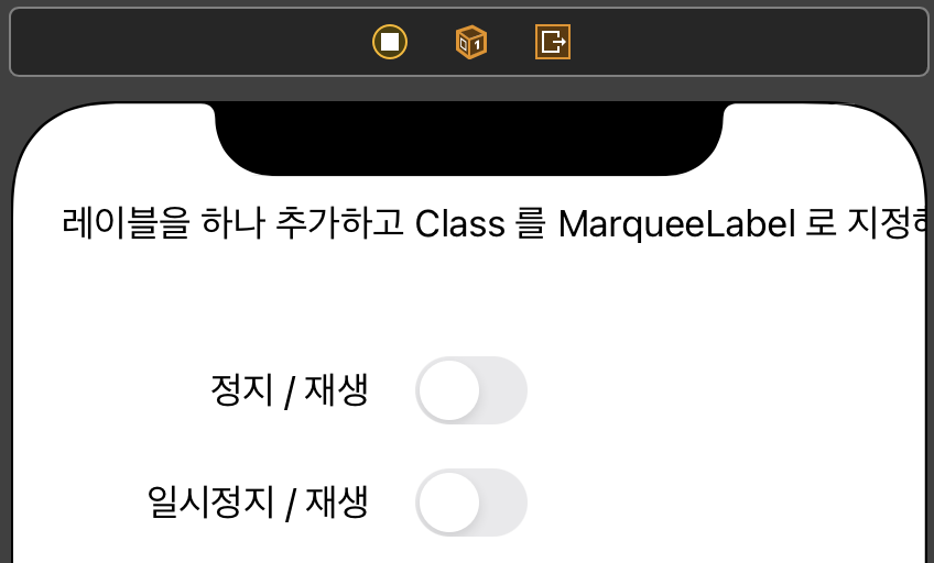 ※ 여기서 import 에 MarqueeLabel 이 안뜨시는분은 커맨드⌘ + B 를 눌러서 한번 빌드하신 후에 진행해주세요.