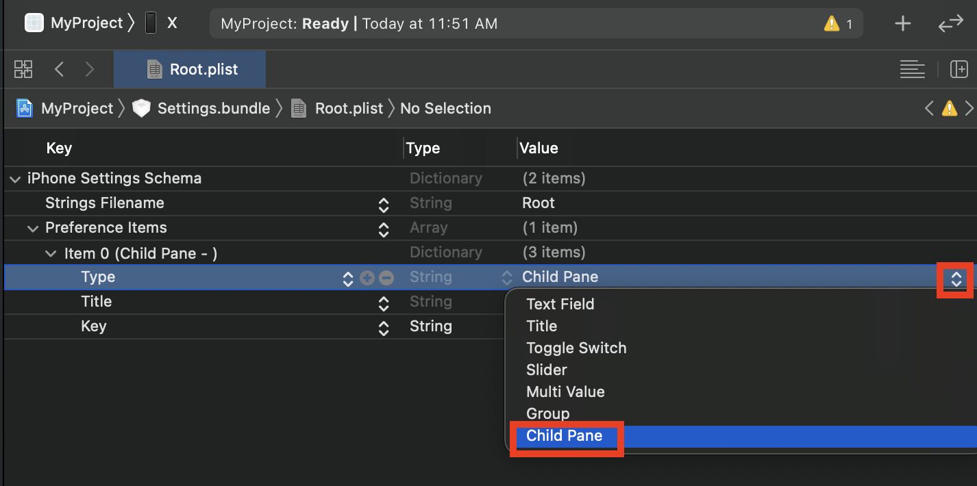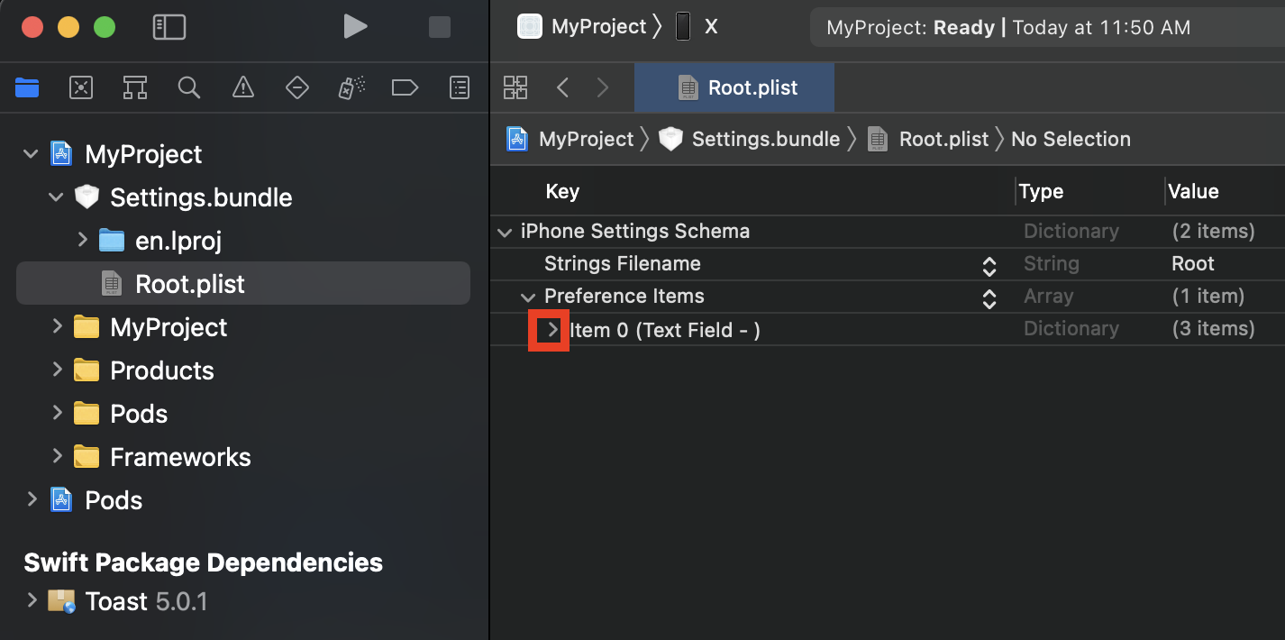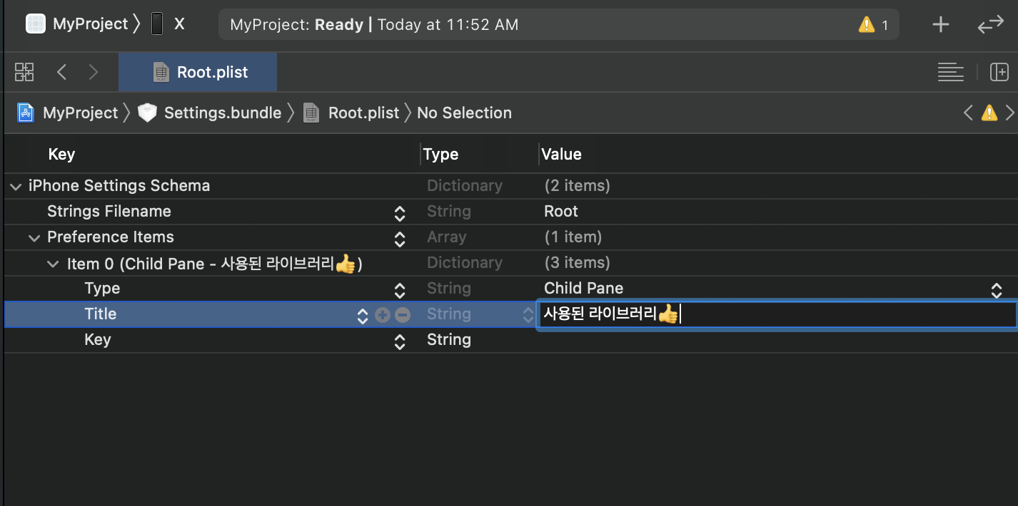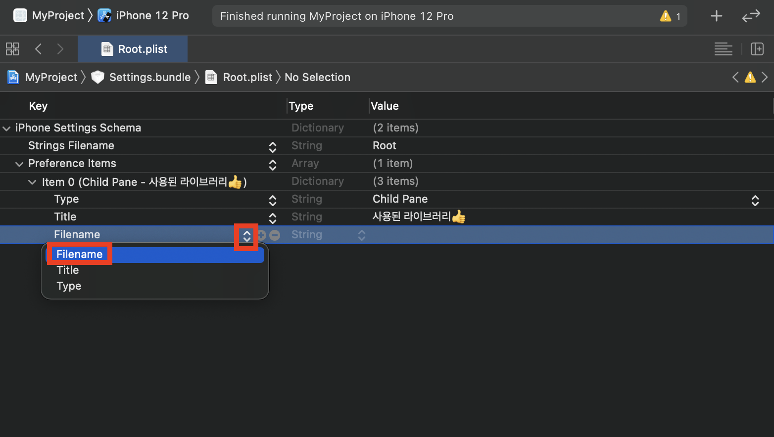 이제 Root.plist 파일에서 맨 밑에 항목이 Key로 되어있을텐데 Filename 으로 변경하고