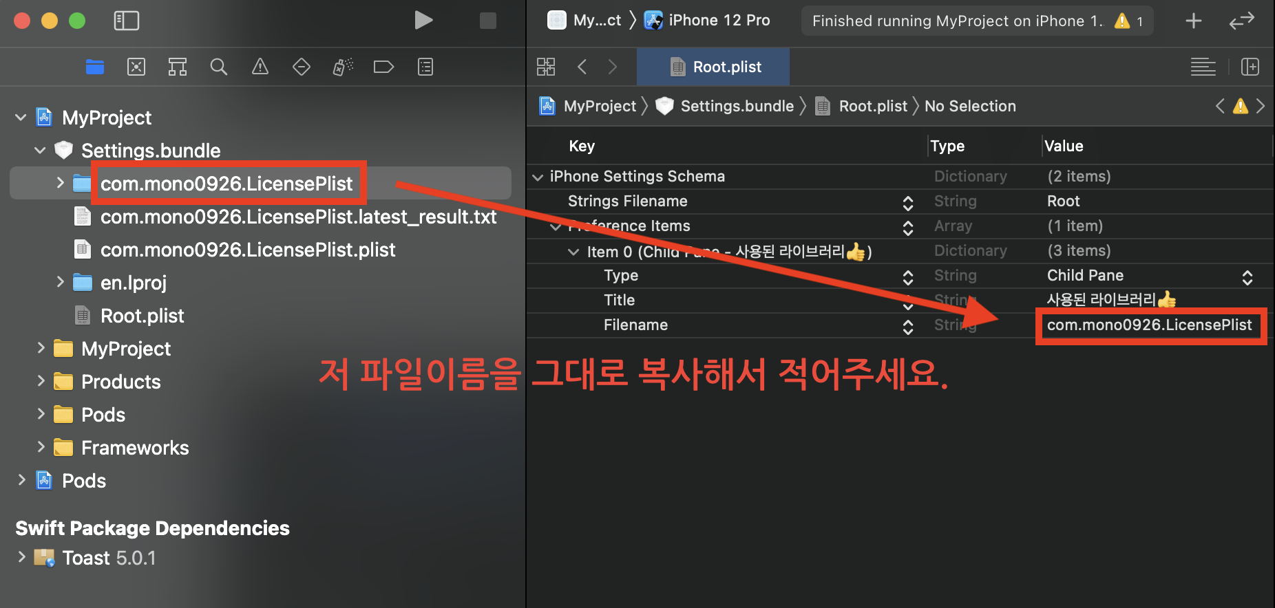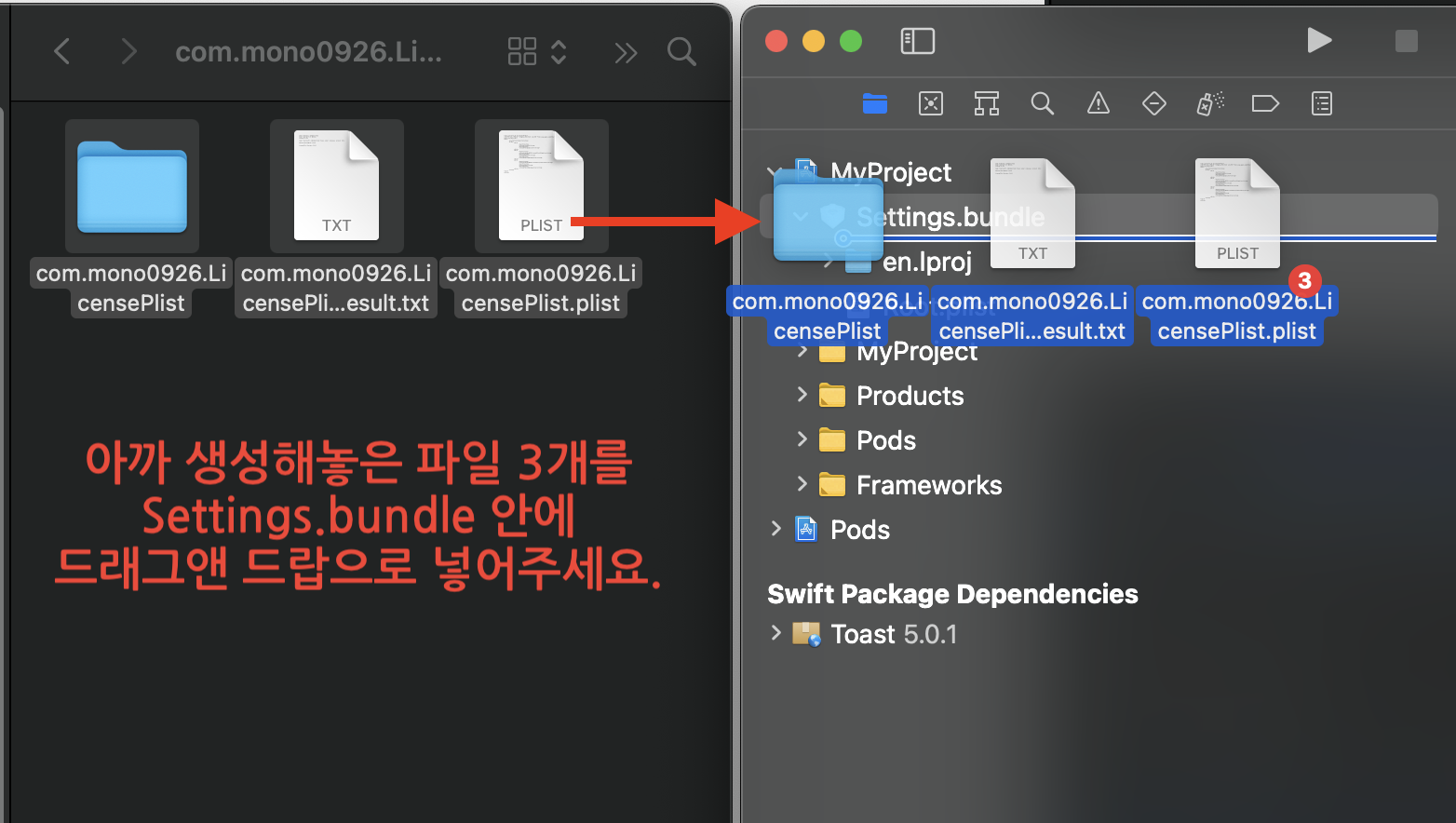 아까 터미널에서 license-plist 명령어로 생성해놓은 파일 3개를 설정파일 안에 추가해주세요.