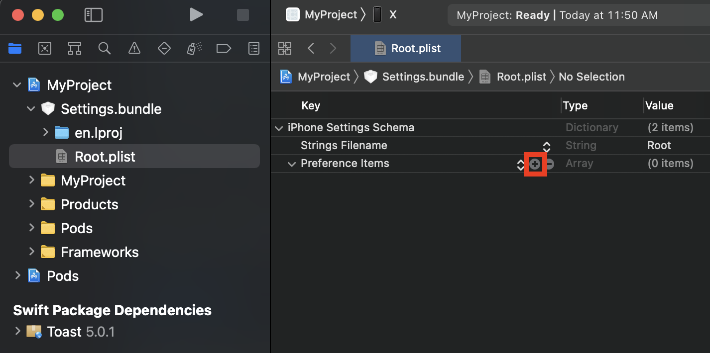 Root.plist 파일에서 기본적으로 생성되어있는 Items 4개를 지워주세요.