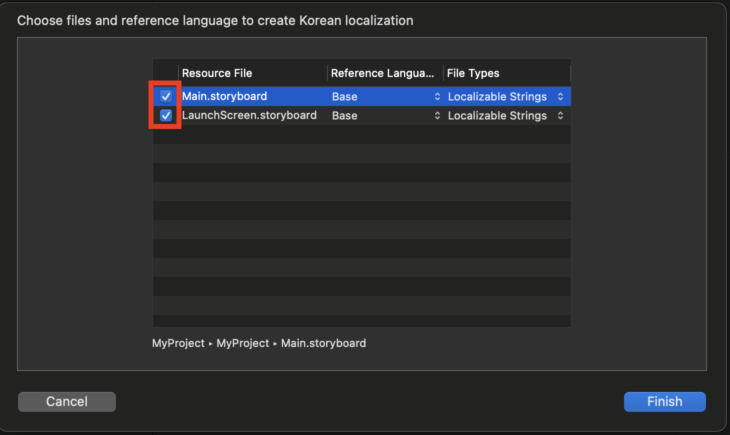 이제 스토리보드를 펼쳐보면 이렇게 언어설정파일이 있습니다.