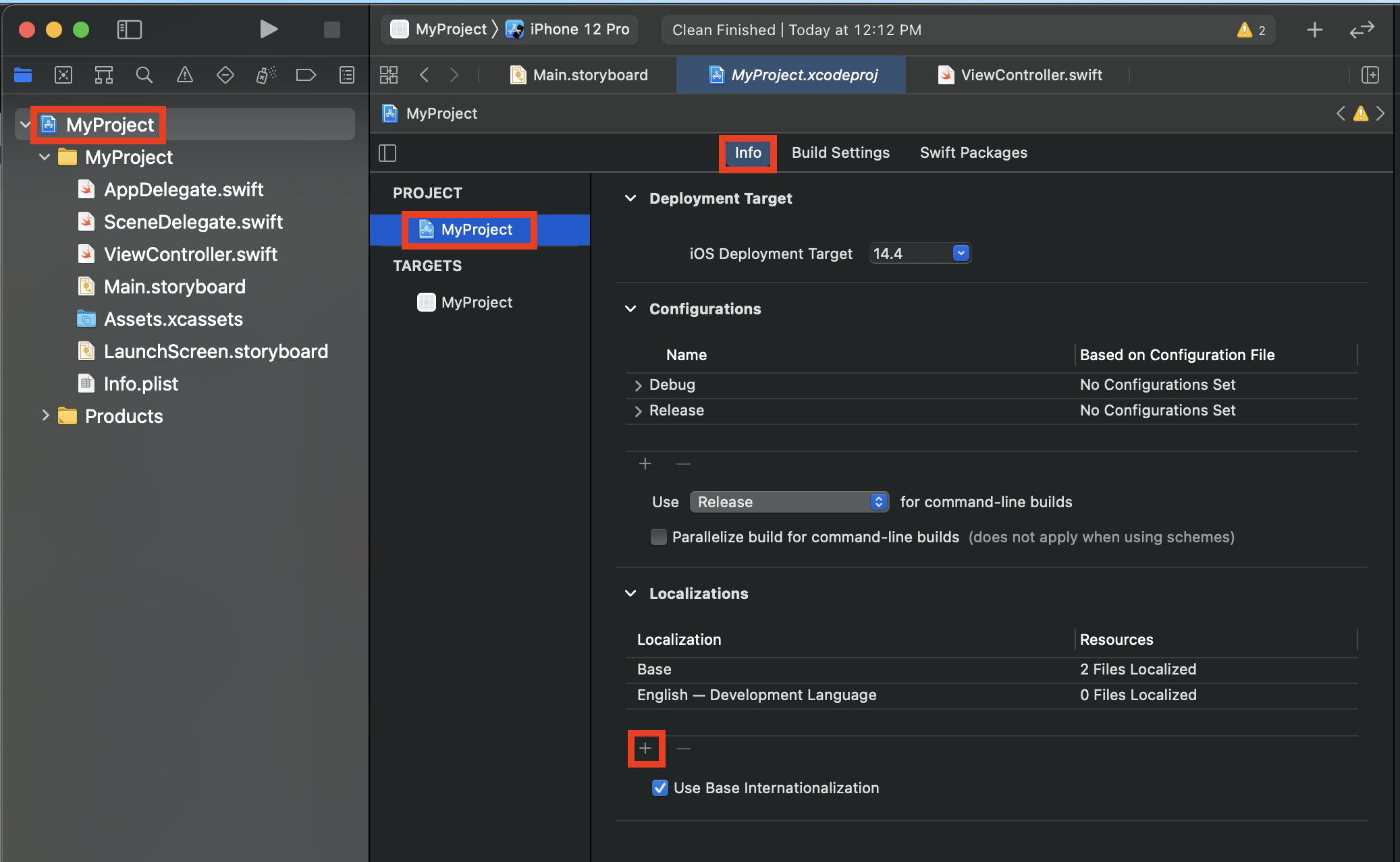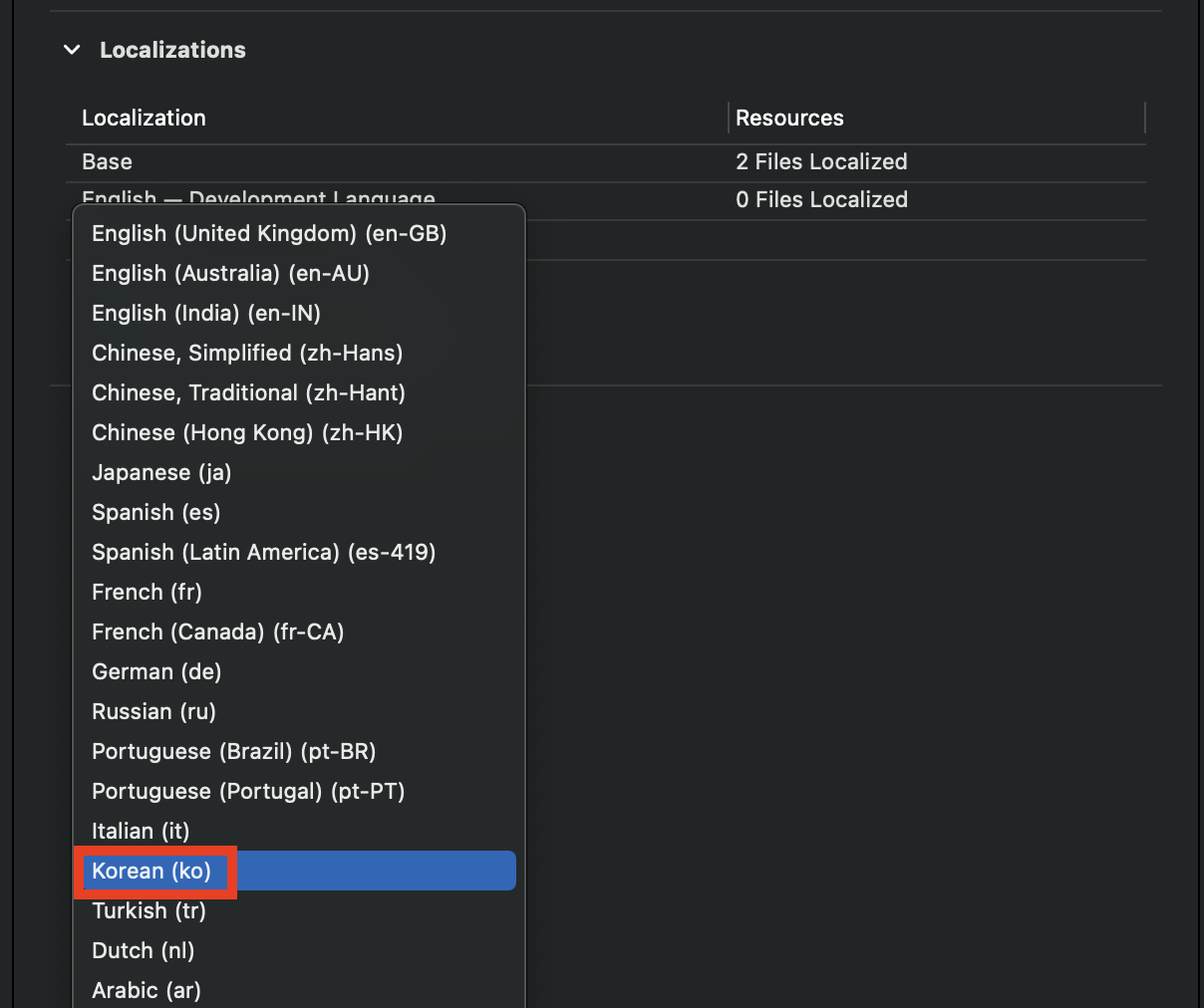 프로젝트 설정에서 Info - Localizations + 버튼을 눌러주세요.