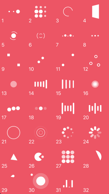 | 1. ballPulse | 2. ballGridPulse | 3. ballClipRotate | 4. squareSpin |