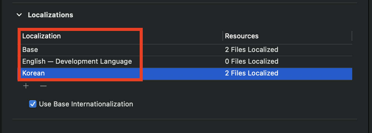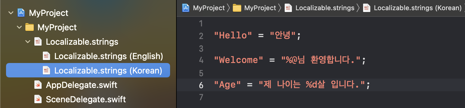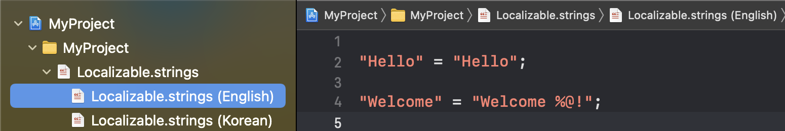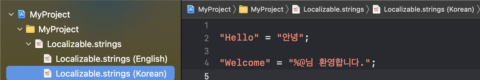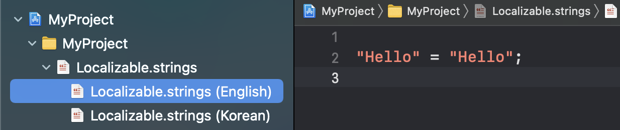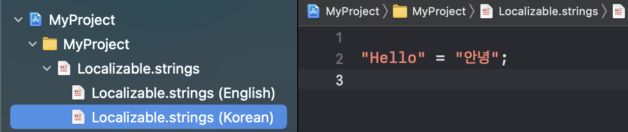 이제 Localizable 파일을 펼쳐보면 2가지 언어가 있을겁니다.