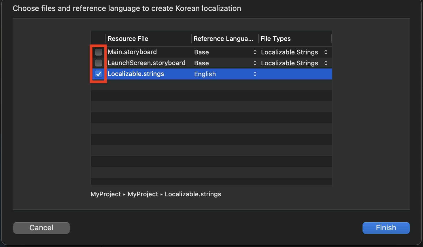 스토리보드들은 체크를 해제하고 스트링파일만 체크해주세요.