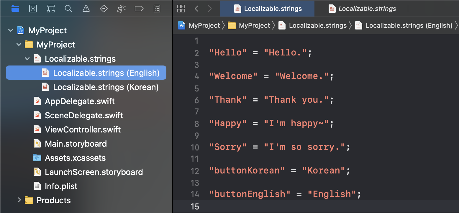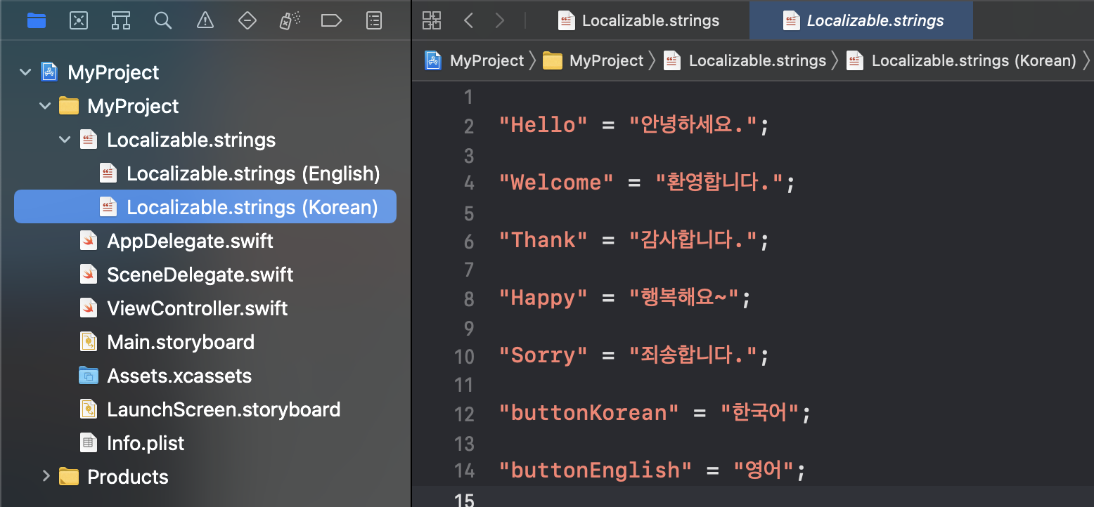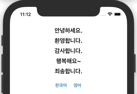 그래서 다국어 설정 파일에 접근해서 localizedString 으로 언어를 변경해줍니다.