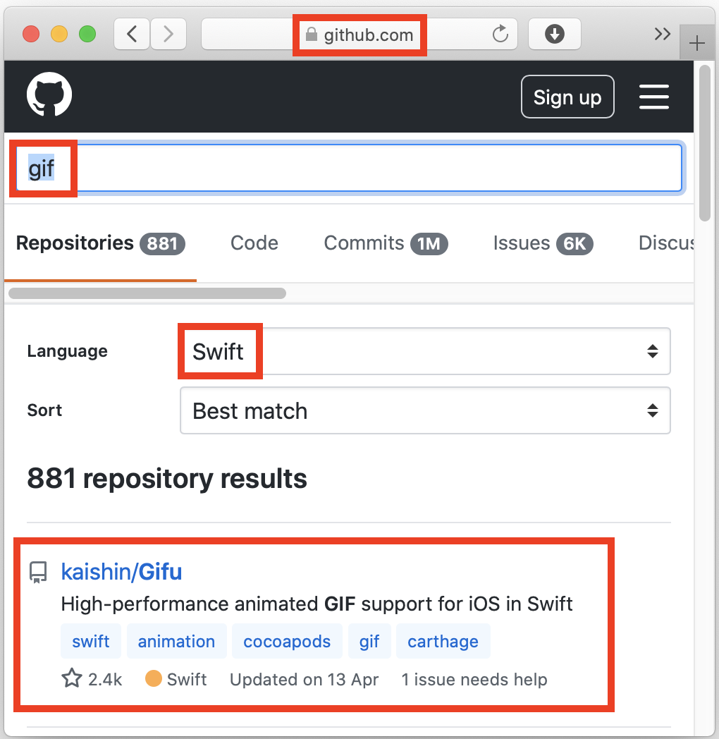Github 에서 gif 를 검색하고 swift 를 필터해서 최상단에 나오는 것으로 사용하겠습니다.